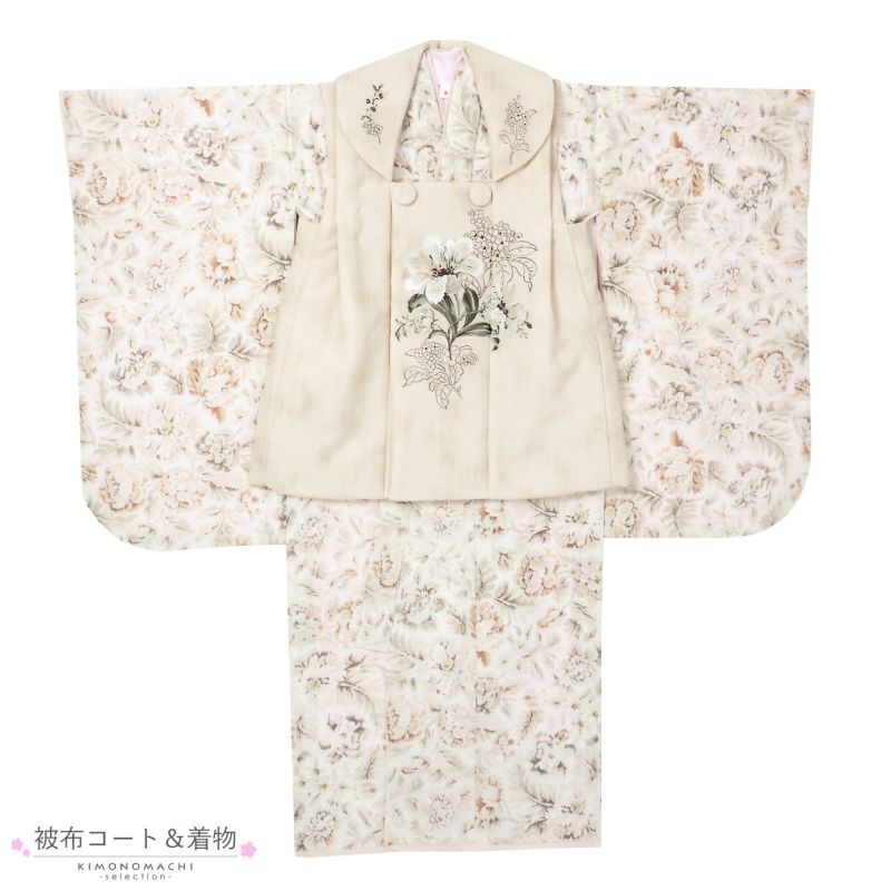 女の子の七五三に!3歳から着られる被布セットです。お着物には重ね衿が縫い付けられています。豪華で女の子らしく華やかなデザイン。七五三だけでなく、お正月やひな祭りの節句にも。