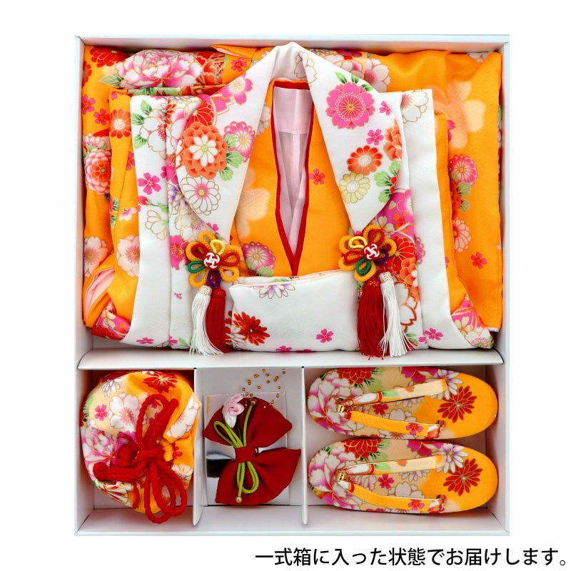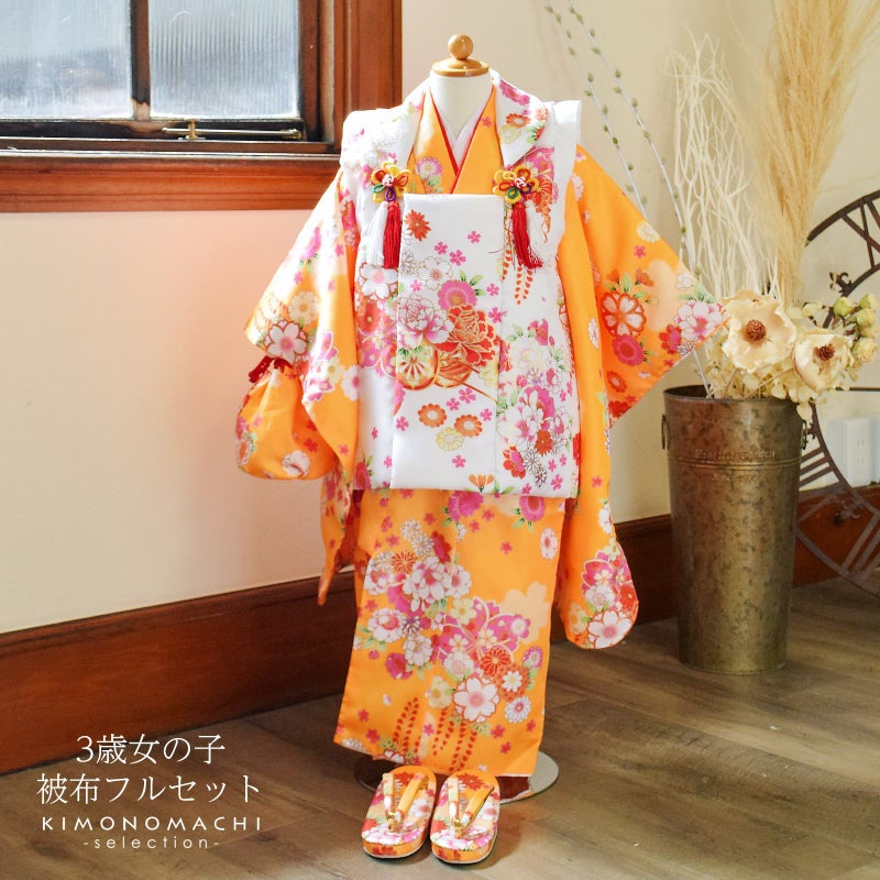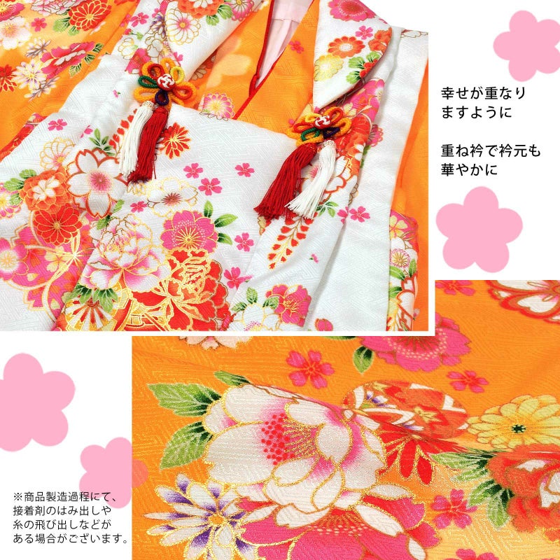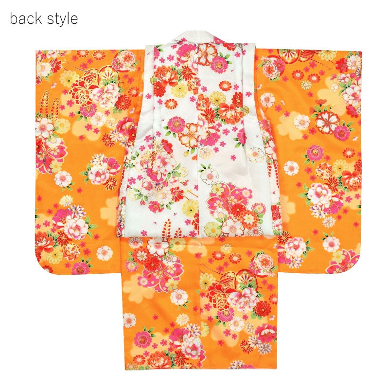 【色柄】被布コートは紗綾形の地模様のある白地に、赤やピンク、オレンジを基調とした牡丹や桜の花車。黄色や赤、緑の花結びに紅白の房の被布飾りがついています。着物は明るい山吹色地に、赤や濃いピンク、白にピンクぼかしやオレンジ色、淡い黄色、薄紫の牡丹の花車に桜や菊、藤の花。ポイントに金彩。赤の重ね衿。薄ピンクの長襦袢。赤いリボンに薄ピンクのつまみのお花の髪飾り。着物と共生地の草履と巾着。