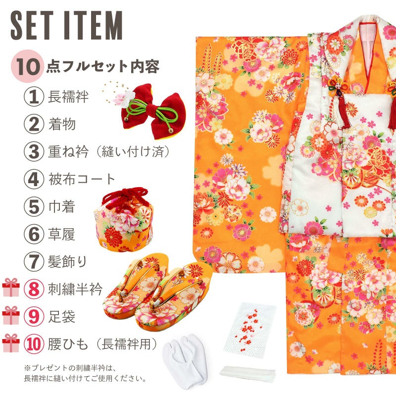 【商品内容】長襦袢・着物・重ね衿(縫い付け済)・被布コート・巾着・草履・髪飾り・刺繍半衿(プレゼント)・足袋(プレゼント)・腰ひも1本(プレゼント)の10点セット