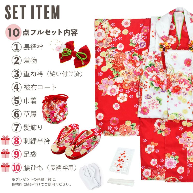 【商品内容】長襦袢・着物・重ね衿(縫い付け済)・被布コート・巾着・草履・髪飾り・刺繍半衿(プレゼント)・足袋(プレゼント)・腰ひも1本(プレゼント)の10点セット