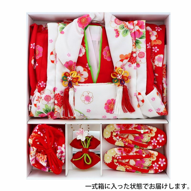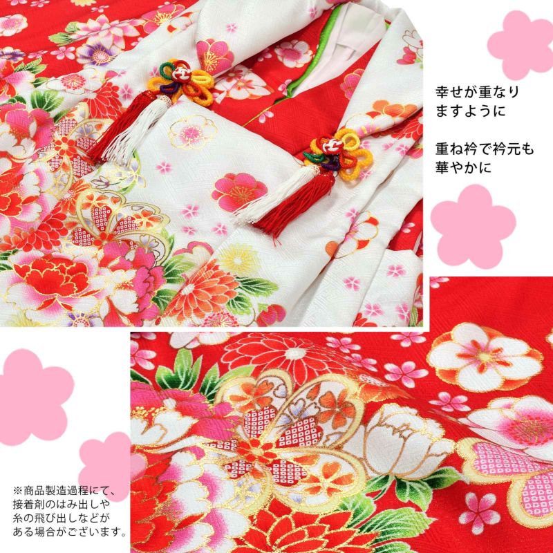 【色柄】被布コートは紗綾形の地模様のある白地に赤やピンクを基調とした牡丹、花紋や花の丸。黄色や赤、緑の花結びに紅白の房の被布飾りがついています。着物は明るい赤地、白にピンクぼかしやオレンジ色の桜模様。赤や濃いピンク、淡い黄色、緑の花紋や花の丸が全体に散らされています。ポイントに金彩。明るい緑の重ね衿。薄ピンクの長襦袢。赤いリボンに薄ピンクのつまみのお花の髪飾り。着物と共生地の草履と巾着。