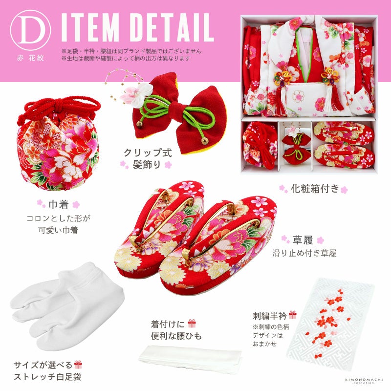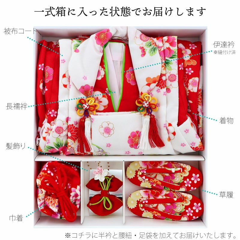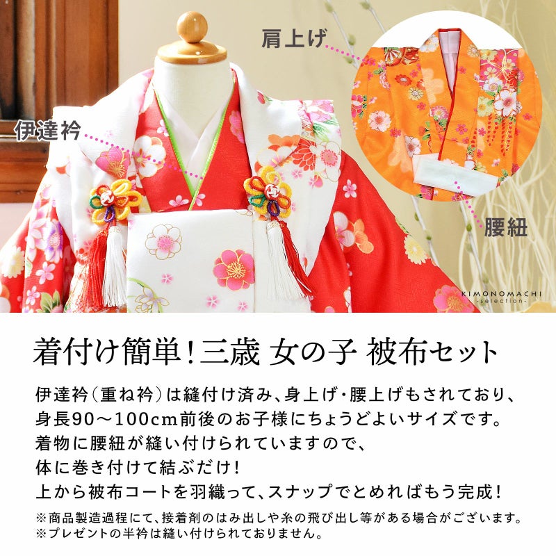 【商品内容】長襦袢・着物・重ね衿(縫い付け済)・被布コート・巾着・草履・髪飾り・刺繍半衿(プレゼント)・足袋(プレゼント)・腰ひも1本(プレゼント)の10点セット