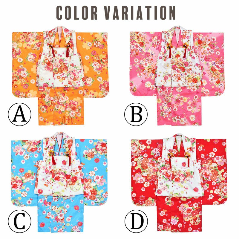 被布コートは紗綾形の地模様のある白地に、赤やピンク、オレンジを基調とした牡丹や桜の花車。黄色や赤、緑の花結びに紅白の房の被布飾りがついています。着物は明るい山吹色地に、赤や濃いピンク、白にピンクぼかしやオレンジ色、淡い黄色、薄紫の牡丹の花車に桜や菊、藤の花。ポイントに金彩。赤の重ね衿。薄ピンクの長襦袢。赤いリボンに薄ピンクのつまみのお花の髪飾り。着物と共生地の草履と巾着。