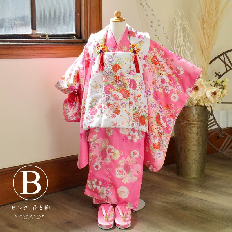 被布コートは紗綾形の地模様のある白地に、赤やピンク、薄紫を基調とした桜花や蘭に鞠。黄色や赤、緑の花結びに紅白の房の被布飾りがついています。着物は明るい濃ピンク地、白にピンクぼかしやオレンジ色、淡い黄色、薄紫の桜や蘭。赤や濃いピンクの手鞠。ポイントに金彩。赤の重ね衿。薄ピンクの長襦袢。赤いリボンに薄ピンクのつまみのお花の髪飾り。着物と共生地の草履と巾着。