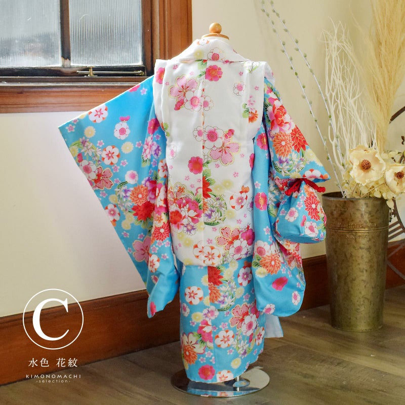 被布コートは紗綾形の地模様のある白地に赤やピンクを基調とした牡丹、花紋や花の丸。黄色や赤、緑の花結びに紅白の房の被布飾りがついています。着物はややグレイッシュな明るい水色地、白にピンクぼかしやオレンジ色の桜模様。赤や濃いピンク、淡い黄色、緑の花紋や花の丸が全体に散らされています。ポイントに金彩。赤の重ね衿。薄ピンクの長襦袢。赤いリボンに薄ピンクのつまみのお花の髪飾り。着物と共生地の草履と巾着。
