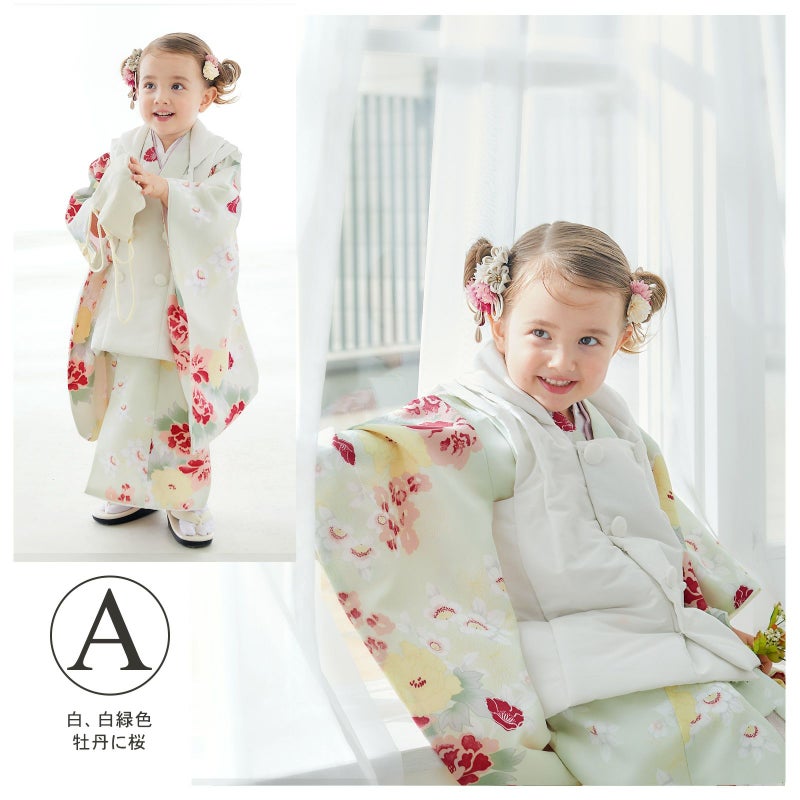 A.白、白緑色 牡丹に桜:被布コートはややグレイッシュなオフホワイト。くるみボタンの被布飾り。着物は淡いグレイッシュな薄緑色の地に、白、紅色、濃いピンク、浅い黄色に灰緑の牡丹に桜、糸菊。重ね衿はパープルグレー。薄ピンクの長襦袢。草履はピンクベージュの台にアイボリーの鼻緒。アイボリーやくすみピンク、ワイン色のお花にグレージュのつまみ、シルバーホワイトの水引の髪飾り。巾着は浅いアイボリーにアイボリーの持ち手。