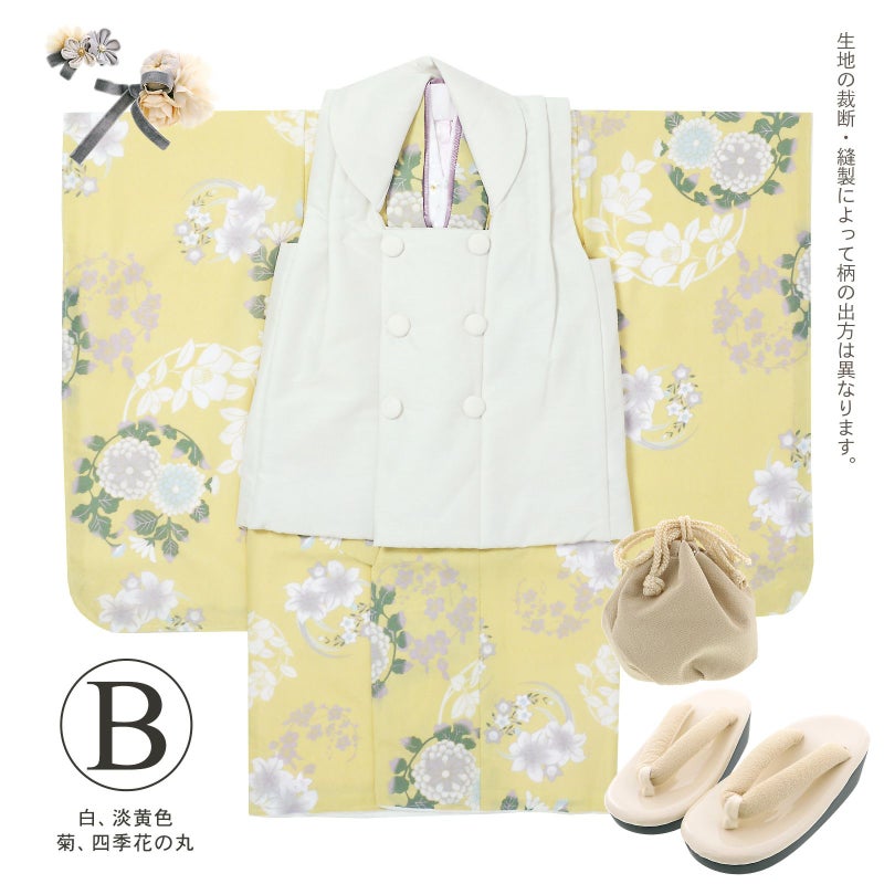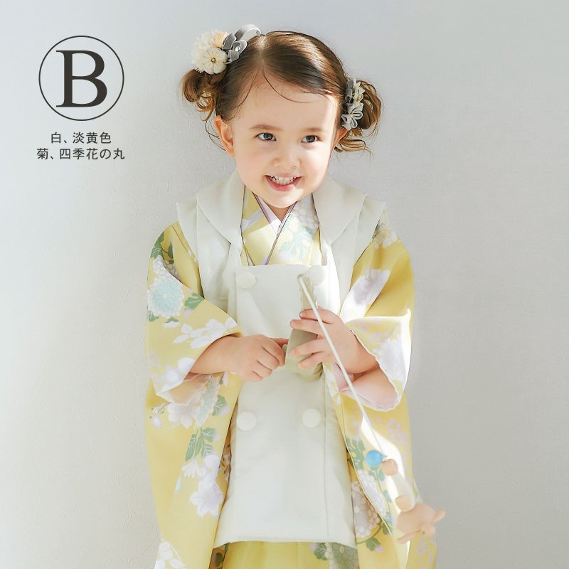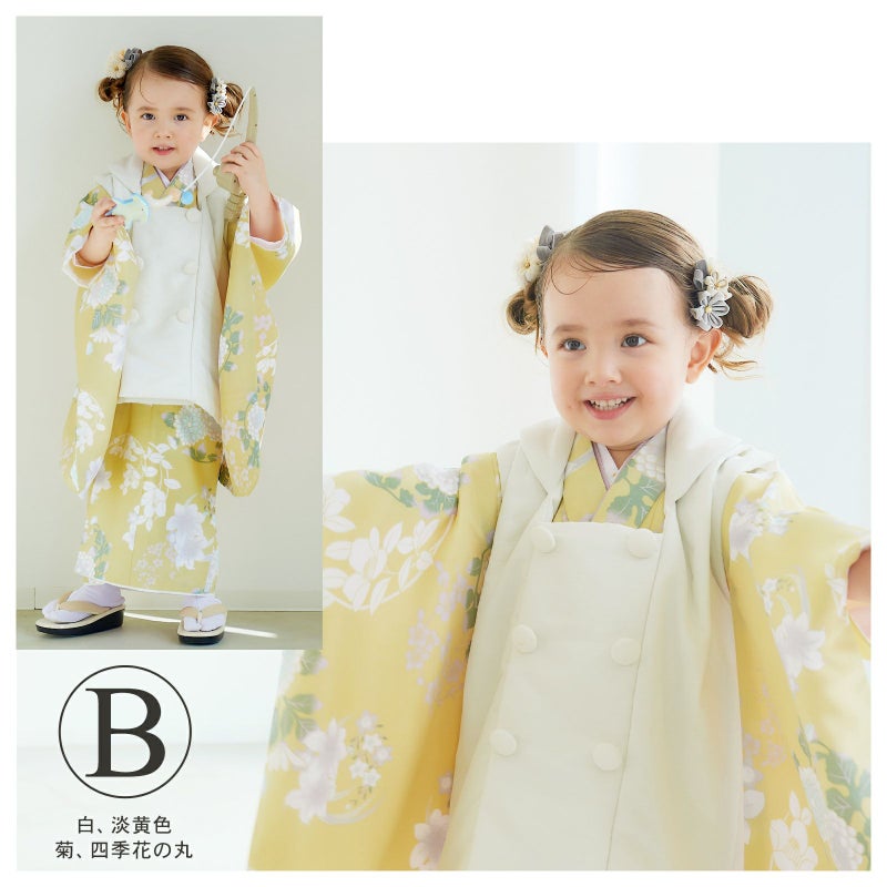 B.白、淡黄色 菊、四季花の丸:被布コートはややグレイッシュなオフホワイト。くるみボタンの被布飾り。着物はグレイッシュな淡い黄色の地に、白、灰緑に淡い藤色やグレーの菊の丸と、百合や椿、梅などの四季花の丸。重ね衿はパープルグレー。薄ピンクの長襦袢。草履はピンクベージュの台にエクルベージュの鼻緒。アイボリーを基調としたお花とグレーのリボンの髪飾り。巾着はくすみベージュにアイボリーの持ち手。