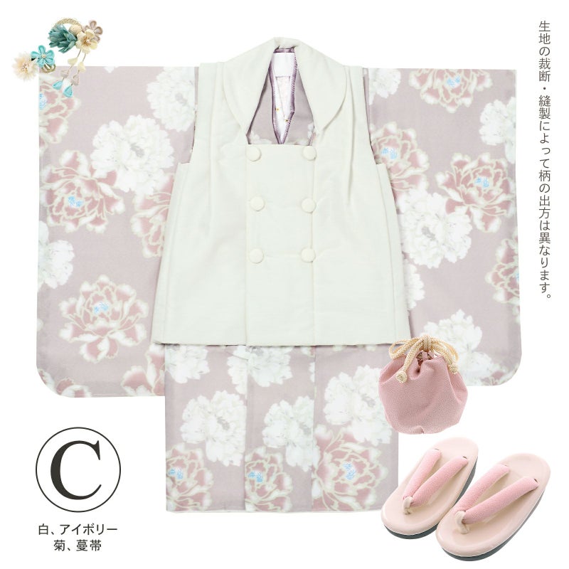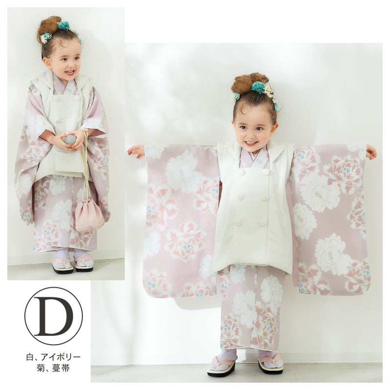 D.白、紅藤色 牡丹:被布コートはややグレイッシュなオフホワイト。くるみボタンの被布飾り。着物はグレイッシュな淡い藤色の地に、白、くすみピンクに灰緑、水色の挿し色の牡丹の花。重ね衿はパープルグレー。薄ピンクの長襦袢。草履は淡いピンクベージュの台に薄ピンクの鼻緒。白にグレージュ、浅葱色のつまみのお花とゴールドの水引の髪飾り。巾着はくすみピンクにアイボリーの持ち手。