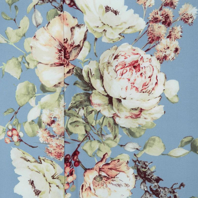 着物はグレイッシュな青紫系の水色の地。白に淡いピンクベージュのバラやアネモネ、木の実、黄緑の濃淡のあるリーフなどの花々の柄。赤紫色や深緑の陰影をつけた洋風のタッチが個性的です。淡いクリーム色の半衿。薄ピンクの長襦袢。帯はオフホワイトの地にアイボリーの七宝に星文様。
