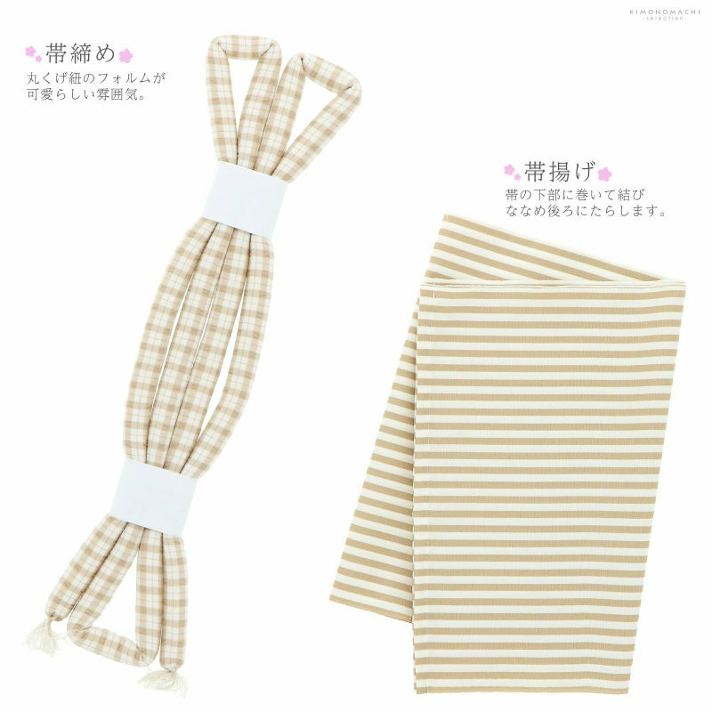 七歳の七五三(四つ身着物)の着付けに必要なものが揃ったフルセットです。お着物には、重ね衿が縫い付けられています。女の子らしい可愛らしく華やかな色合い。ポリエステル素材ですが、高級感があります。