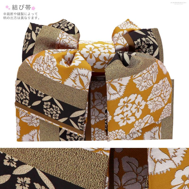 帯:黒地にゴールドの花菱に破れ七宝文様、マスタード地に白の華紋、ゴールドの地がボーダー状に配置されています。