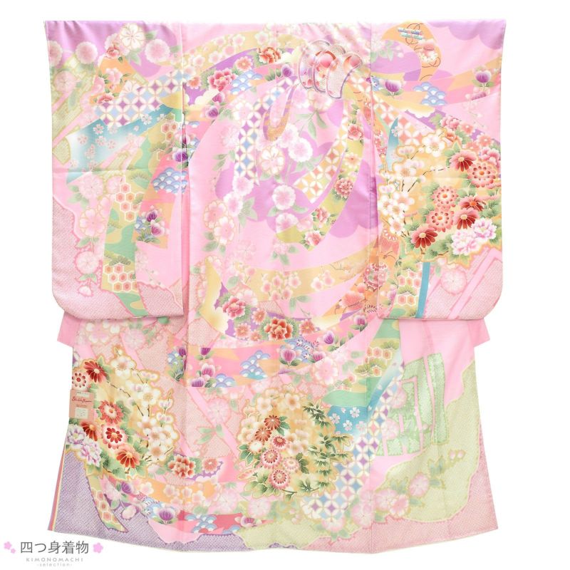 着物は淡いピンクの地に紗綾形の地模様。淡い桃色や藤色、抹茶色の鹿の子の雲取りや源氏香。背には淡いベージュや藤色、黄緑に吉祥文様を詰めた束ね熨斗。やわらかいピンク、緑、橙、朱色など桜や菊、梅などの四季の花。ポイントに金糸やラメ糸の刺繍。褄下に藤色、桃色、オフホワイトの比翼風の飾り布。重ね衿はオフホワイト。