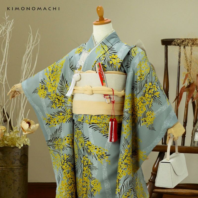【色柄】細かな地模様のある生地。ややグレイッシュな淡いブルーグリーンの地に白くかすれた立涌文様。その上にふっさりと花をつけたミモザの模様。黄色に鶸色や金茶色のぼかしの入った丸い花々、深緑色の羽根状の葉。ミントカラーの軽やかさと、模様の曲線的なやわらかさが魅力的なデザインです。裏地は白