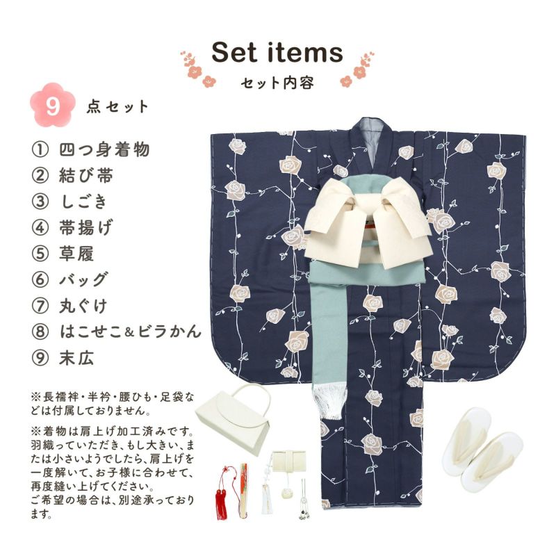 【商品内容】四つ身着物、結び帯、しごき、帯揚げ、草履、バッグ、丸ぐけ、はこせこ&ビラかん、末広の9点セット