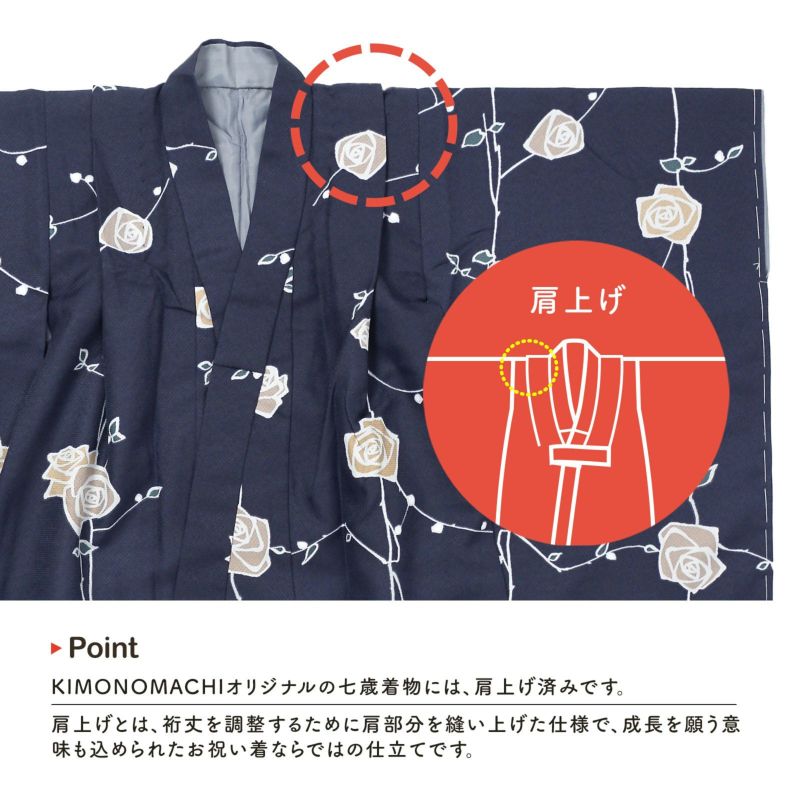 ※着物は肩上げ加工済みです。羽織っていただき、もし大きい、または小さいようでしたら、肩上げを一度解いて、お子様に合わせて、再度縫い上げてください。