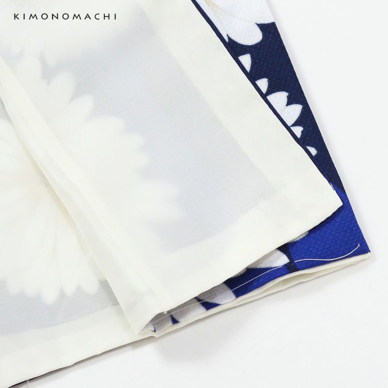 着物:細かな地模様のある生地。あざやかな青の地に紺の矢羽根、白に淡いベージュのぼかしの大小の菊の花。ハッキリと冴えた色合いとアンティーク調の大胆な柄行が魅力です。裏地はオフホワイト。