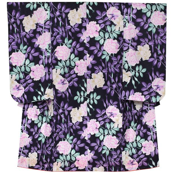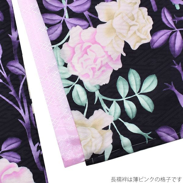 【カラー】着物は、黒色地に紫色、イエローベージュの薔薇模様。襦袢はごく淡いピンク色。