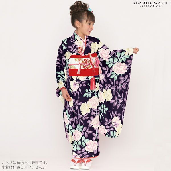 七歳の七五三のお着物(四つ身着物)と長襦袢のセットです。お着物には、重ね衿が縫い付けられています。女の子らしい可愛らしく華やかな色合い。ポリエステル素材ですが、高級感あります。衿元も重ね衿がついているので華やかです。