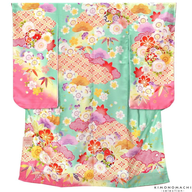 【色柄】ミントグリーンと淡いクリーム色のぼかしの地。裾は明るいピンク。オレンジ色の七宝模様や、薄紫、芥子色、深い橙色、淡いピンクなどの松竹梅に桜楓文、赤い牡丹と色とりどりの華やかな着物です。ポイントに金の刺繍。袖口や裾のふき、重ね衿は赤い鹿の子。薄ピンクの襦袢。現代的で軽やかな色遣いが可愛らしい晴れ着です。