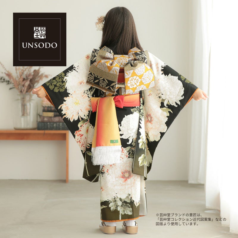 帯:黒地にゴールドの花菱に破れ七宝文様、マスタード地に白の華紋、ゴールドの地がボーダー状に配置されています。