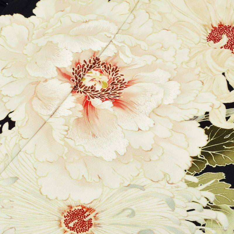 着物:黒地に黄土色の花菱。白に淡いピンク、薄ベージュ、ポイントに深い赤で大輪の牡丹や糸菊が表現されています。ポイントの花弁に刺繍。ブロンズの重ね衿。薄ピンクの襦袢。