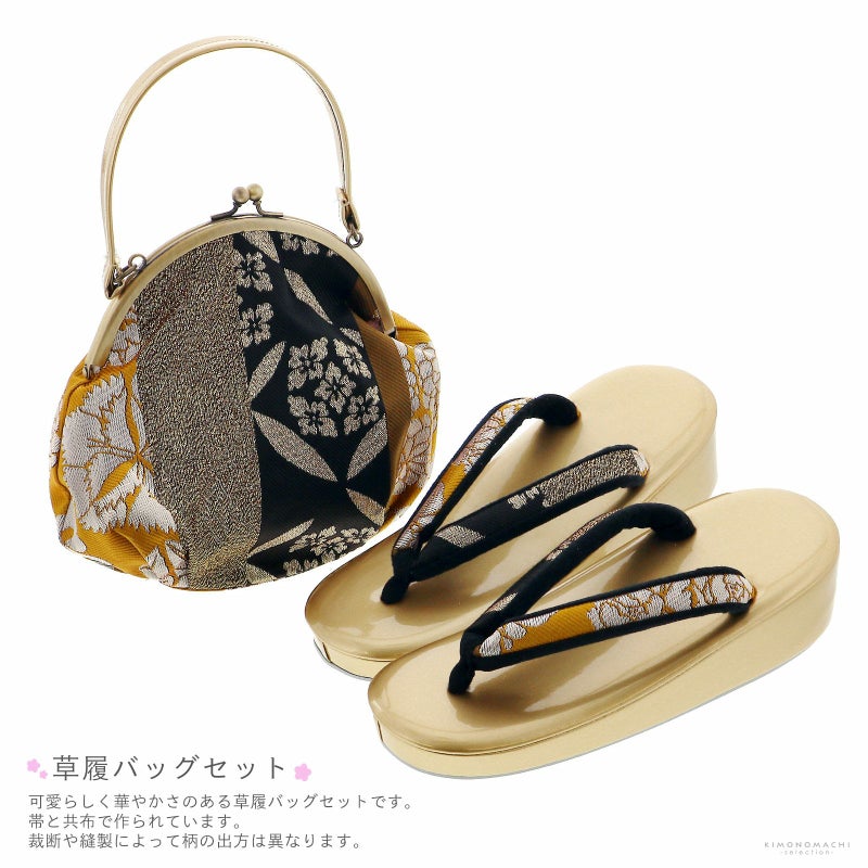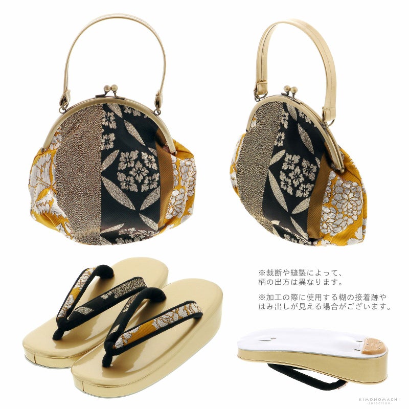 草履・バッグ:バッグの本体と草履の鼻緒は、黒地にゴールドの花菱七宝文様、マスタード地に白の華紋、ゴールドの地がボーダー状に配置されています。バッグの持ち手、草履の台はダークゴールド。
