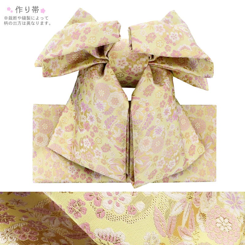 帯はクリームイエローの地に淡いピンク、明るい薄紫色、白にゴールドの菊や梅、笹、藤、楓などの花の丸に小花。
