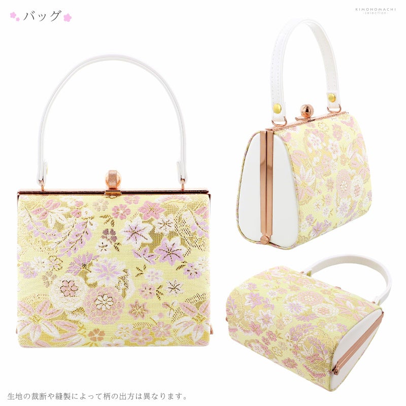 クリームイエローの地に淡いピンク、明るい薄紫色、白、ゴールドの四季の花文様のバッグと筥迫セット。ピンクを基調に、ゴールド、赤、紫の組紐、パールの飾りの帯締め。銀のビラカン。白の扇子や紅白の房飾り。草履は白の台に薄ピンクと白の片ぼかしの鼻緒。