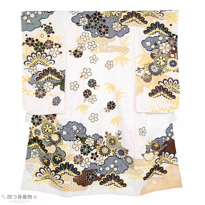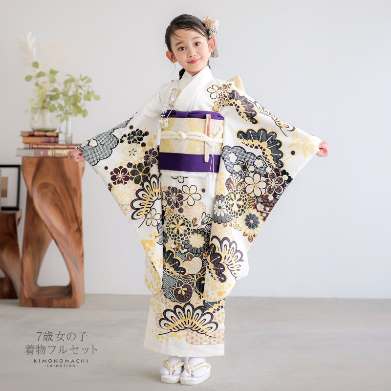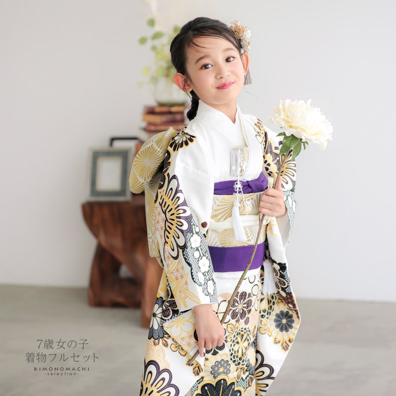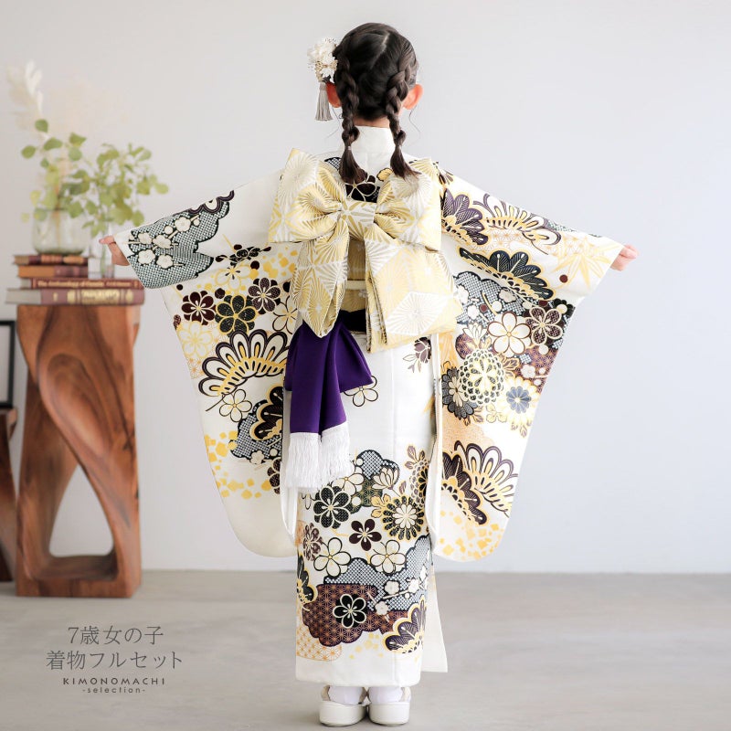 七歳の七五三(四つ身着物)の着付けに必要なものが揃ったフルセットです。お洒落で女の子らしい雰囲気。