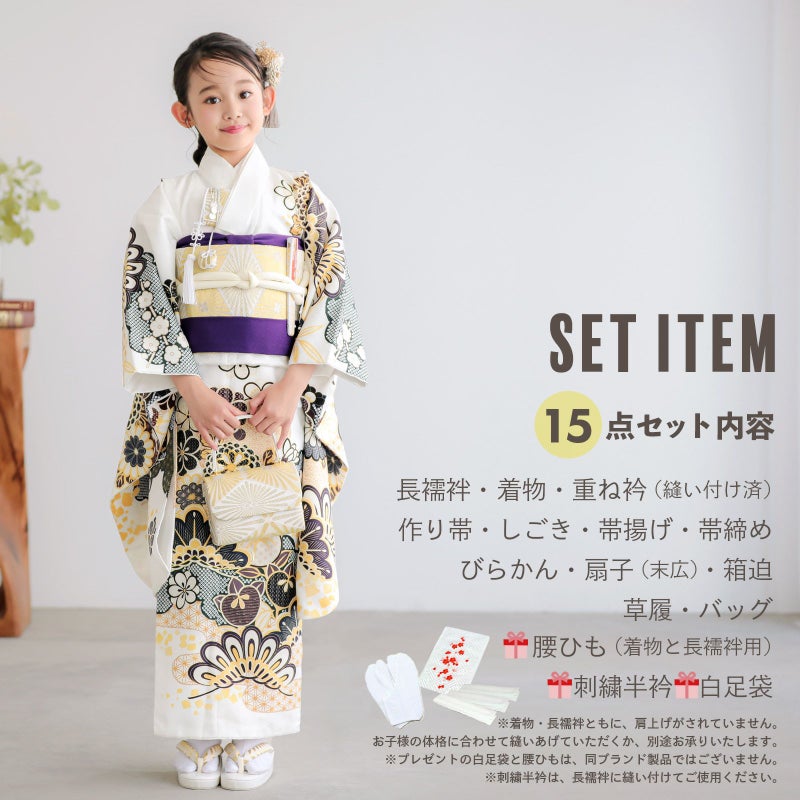 【商品内容】長襦袢・着物・重ね衿(縫い付け済)・作り帯・しごき・帯揚げ・帯締め・びらかん・扇子(末広)・箱迫・草履・バッグ・足袋(プレゼント)・腰ひも3本(プレゼント)・刺繍半衿(プレゼント)の計15点