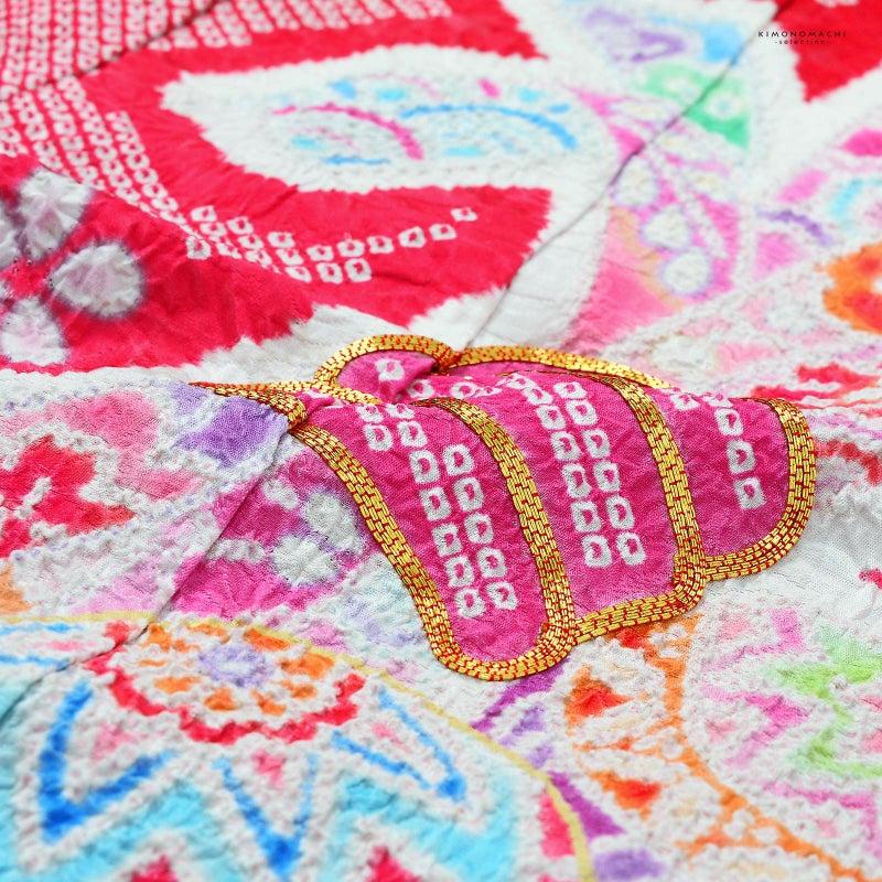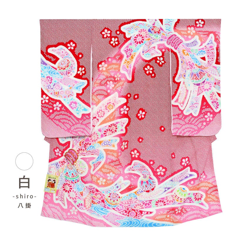 地模様のある生地を、上は赤、裾にかけて明るく柔らかいピンクのぼかしに白の疋田に染め上げた地。背や上前の束ね熨斗は濃いピンク、水色、藤色、薄緑色、淡い橙色などで表現された花紋や吉祥文様が詰められています。その上に手鞠やお花。上前の熨斗の結び目には金駒刺繍。絞りのやわらかな表現と豊かな色彩が上品で華やかな印象です。赤と黄緑の重ね衿。襦袢は薄ピンクの鶴に亀甲の地紋。