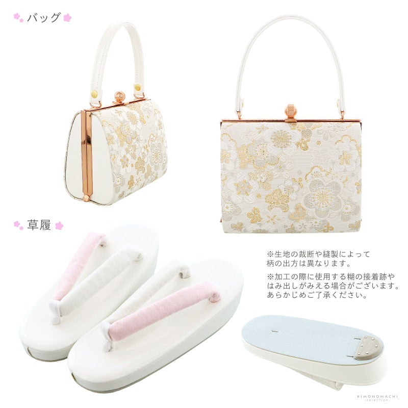 【商品内容】長襦袢・着物・重ね衿(縫い付け済)・作り帯・しごき・帯揚げ・帯締め・箱迫・びらかん・扇子(末広)・草履・バッグ・足袋(プレゼント)・腰ひも3本(プレゼント)・刺繍半衿(プレゼント)の計15点
