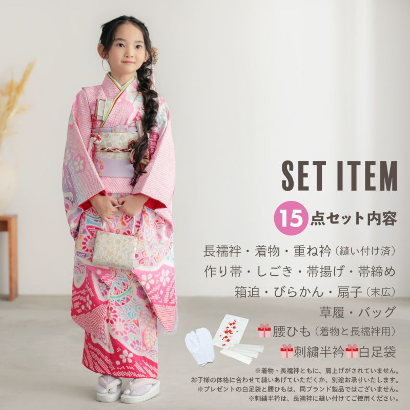七歳の七五三(四つ身着物)の着付けに必要なものが揃ったフルセットです。お洒落で女の子らしい雰囲気。