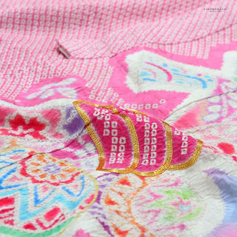 着物は、地模様のある生地を、上は青みピンク、裾にかけて濃いピンクや藤色のぼかしに白の疋田に染め上げた地。背や上前の束ね熨斗は藤色、水色、紅紫、薄緑色、橙色などで表現された花紋や吉祥文様が詰められています。その上に手鞠やお花。上前の熨斗の結び目には金駒刺繍。絞りのやわらかな表現と豊かな色彩が上品で洗練された印象です。黄緑と山吹色の重ね衿。襦袢は薄ピンクの鶴に亀甲の地紋。