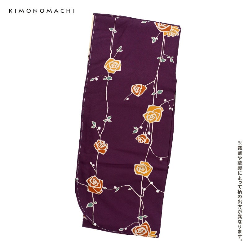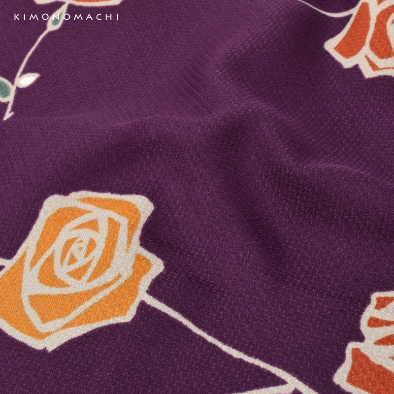 【色柄】細かな地模様のある生地。深い紫色の地に、ごく淡いベージュの輪郭線、浅い橙色や赤茶の花、深い緑の葉のバラの花。やや直線的なデザインと深い色がレトロなかわいらしさを感じさせます。裏地はベージュ。