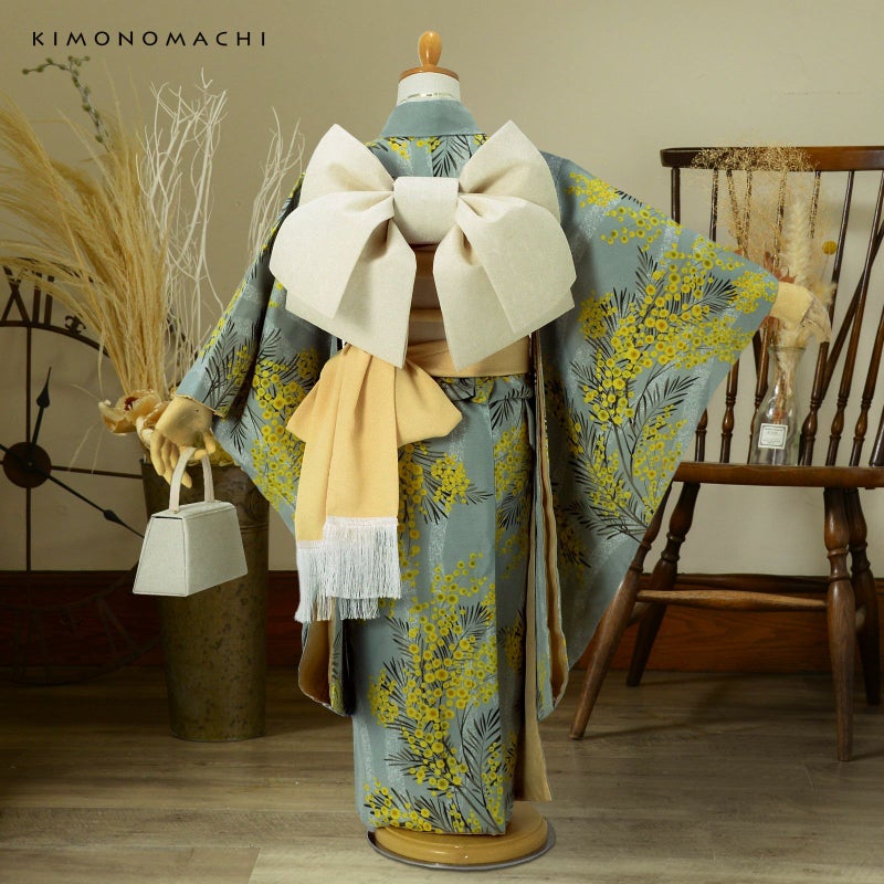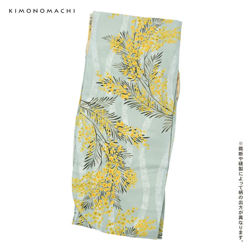 【色柄】細かな地模様のある生地。ややグレイッシュな淡いブルーグリーンの地に白くかすれた立涌文様。その上にふっさりと花をつけたミモザの模様。黄色に鶸色や金茶色のぼかしの入った丸い花々、深緑色の羽根状の葉。ミントカラーの軽やかさと、模様の曲線的なやわらかさが魅力的なデザインです。裏地は白