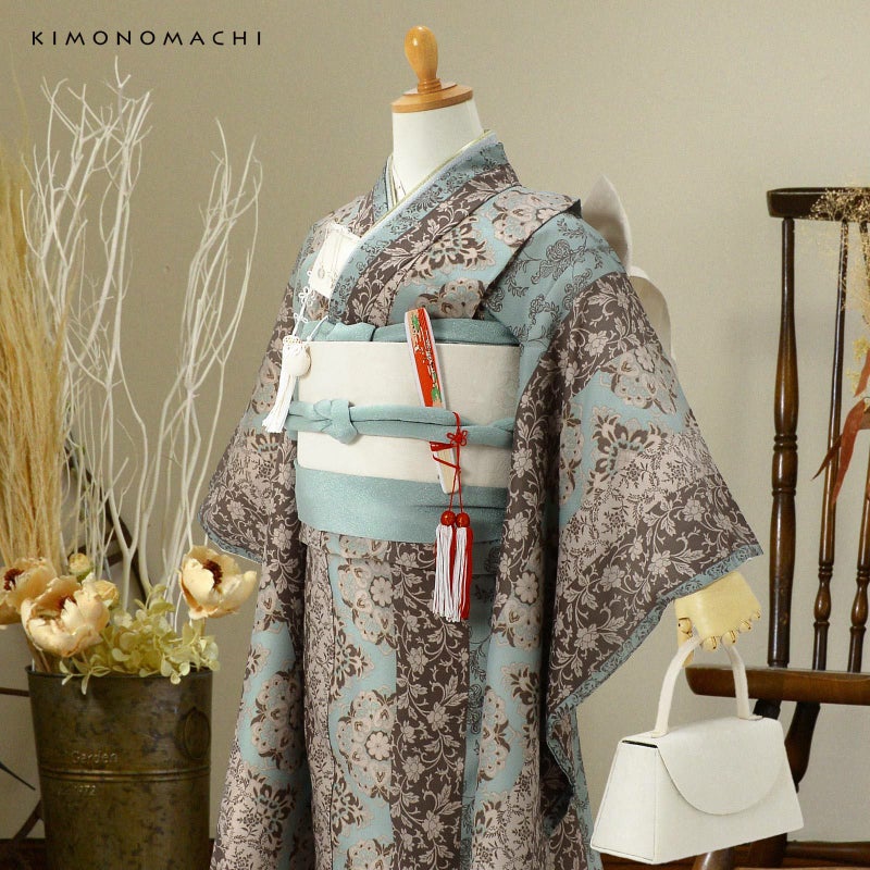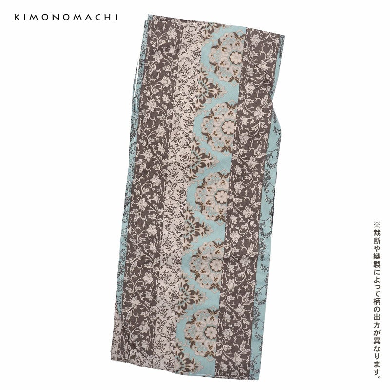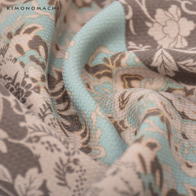 【色柄】細かな地模様のある生地。全体的にグレイッシュな色合いの浅い水色、ベージュ、薄茶色の縦縞。その中にやや鮮やかな水色、薄水色の挿し色が入った大きな華紋や、桃唐草、ペイズリー風の草花など様々な唐草文様。ミントチョコのような現代的な色使いとオリエンタルな文様がお洒落なデザインです。裏地は白。