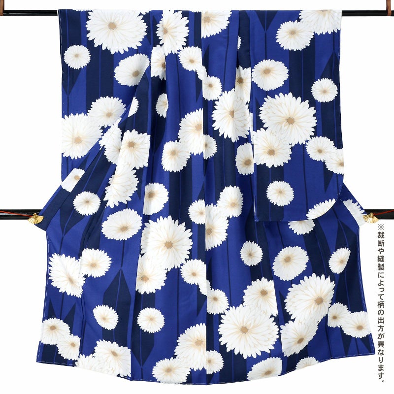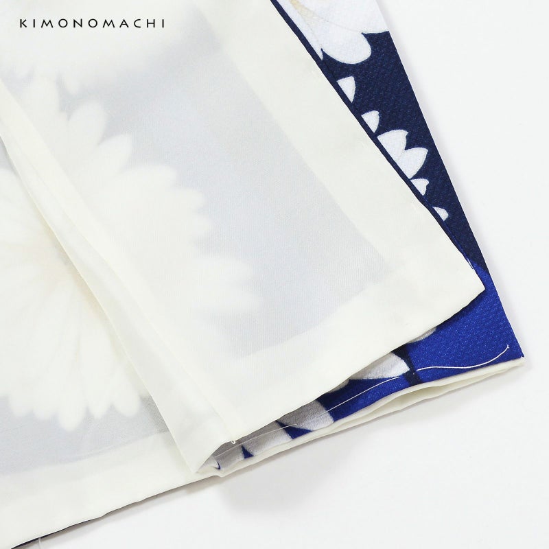 【色柄】細かな地模様のある生地。あざやかな青の地に紺の矢羽根、白に淡いベージュのぼかしの大小の菊の花。ハッキリと冴えた色合いとアンティーク調の大胆な柄行が魅力です。裏地はオフホワイト。