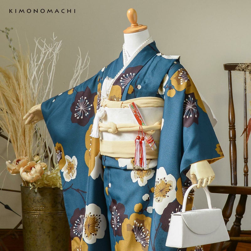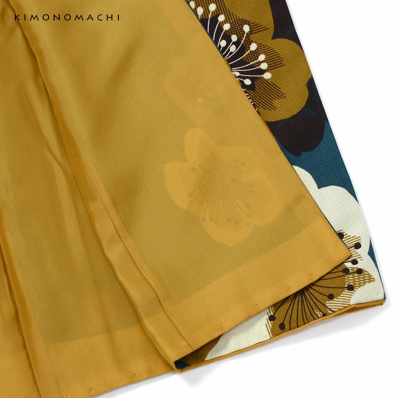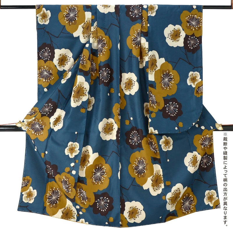 【色柄】細かな地模様のある生地です。落ち着いたテールグリーンの地に、黄土色、生成り色、セピア色の大胆な印象にデザインされた梅の花。花の中心は、ぼかしではなく線を重ねた表現となっています。直線的でエッジのある梅の花の形に、丸く古典的な雰囲気の枝やつぼみが懐かしさを添える、モダンでありながらレトロな魅力のある着物です
