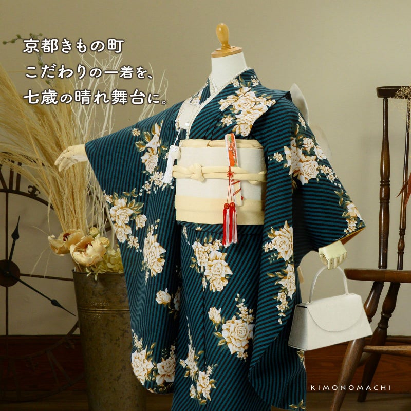 6. 七五三 7歳 四つ身着物セット「ストライプブーケ グリーン」女の子 7才 女児用 子供着物 七才のお祝い着向け KIMONOMACHI オリジナル【メール便不可】