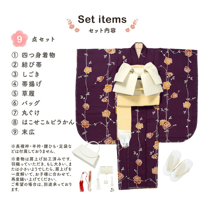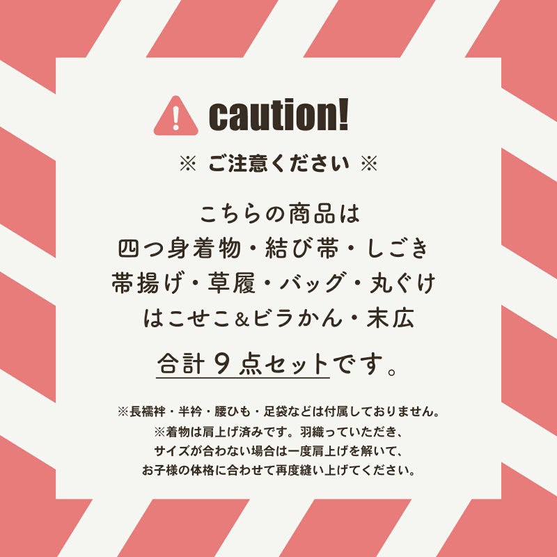 【商品内容】四つ身着物、結び帯、しごき、帯揚げ、草履、バッグ、丸ぐけ、はこせこ&ビラかん、末広の9点セット
