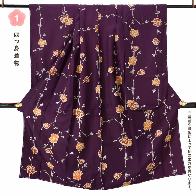 着物:細かな地模様のある生地。深い紫色の地に、ごく淡いベージュの輪郭線、浅い橙色や赤茶の花、深い緑の葉のバラの花。やや直線的なデザインと深い色がレトロなかわいらしさを感じさせます。裏地はベージュ。