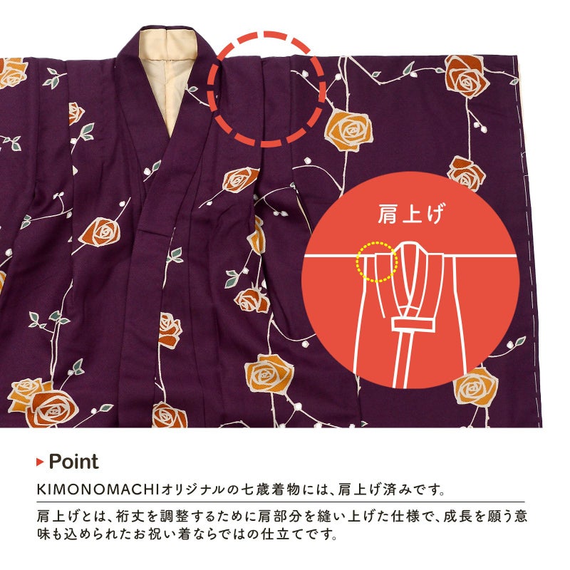 ※着物は肩上げ加工済みです。羽織っていただき、もし大きい、または小さいようでしたら、肩上げを一度解いて、お子様に合わせて、再度縫い上げてください。ご希望の場合は別途承っております。