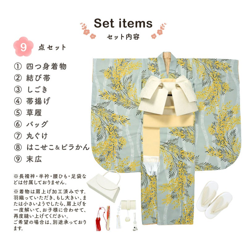 6. 七五三 7歳 四つ身着物セット「ミモザに立涌 錆青磁色」女の子 7才 女児用 子供着物 七才のお祝い着向け KIMONOMACHI オリジナル【メール便不可】