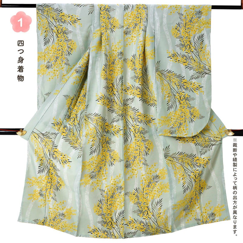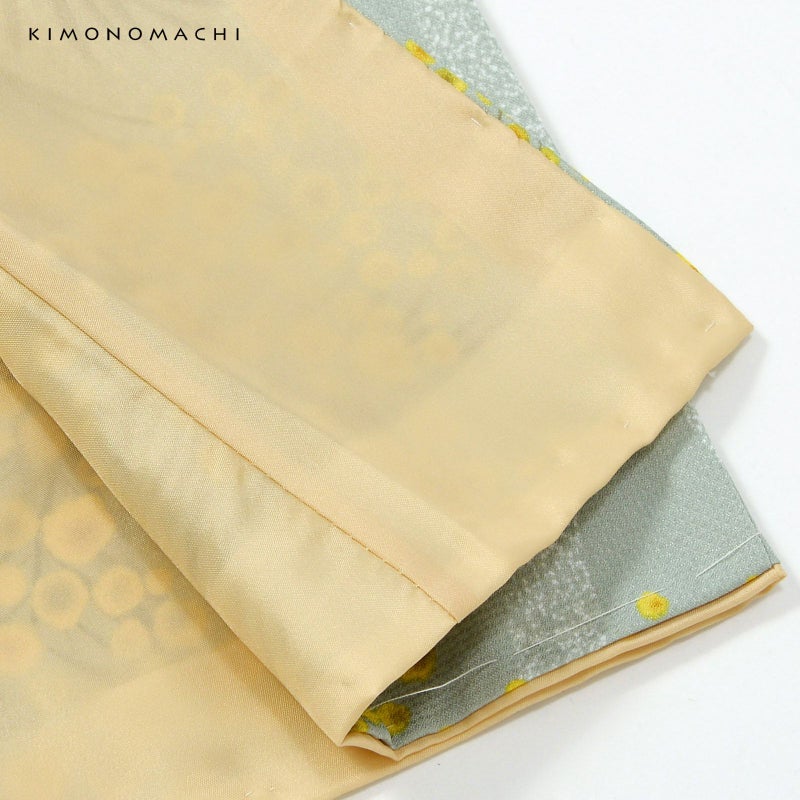 着物:細かな地模様のある生地。ややグレイッシュな淡いブルーグリーンの地に白くかすれた立涌文様。その上にふっさりと花をつけたミモザの模様。黄色に鶸色や金茶色のぼかしの入った丸い花々、深緑色の羽根状の葉。ミントカラーの軽やかさと、模様の曲線的なやわらかさが魅力的なデザインです。裏地は白