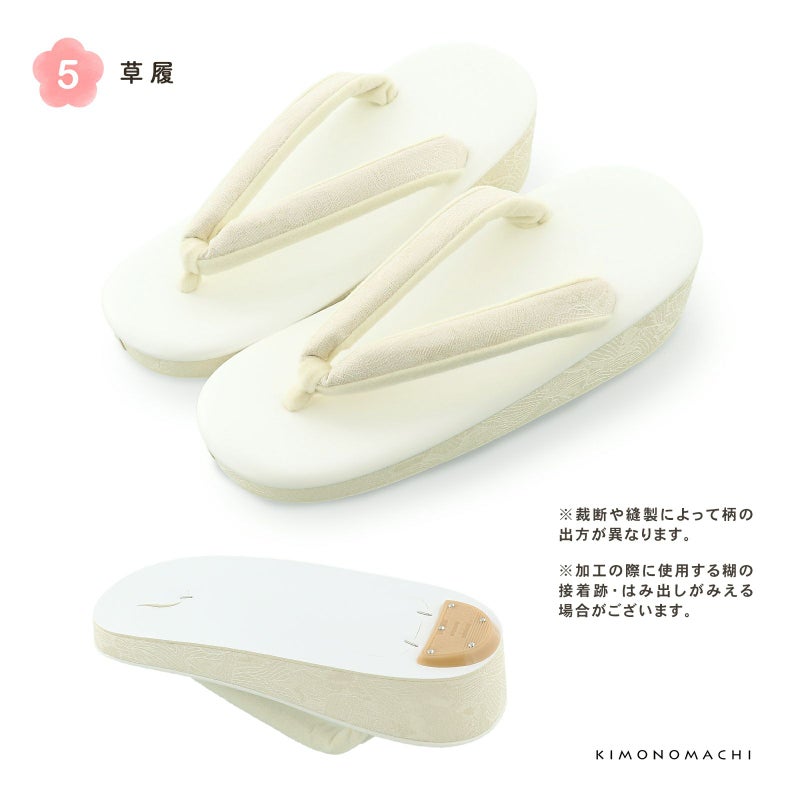 草履:台全長約21.5cm / 幅約7.5cm / 鼻緒幅約2.0cm / かかと高さ約5.0cm