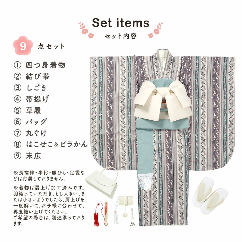 【商品内容】四つ身着物、結び帯、しごき、帯揚げ、草履、バッグ、丸ぐけ、はこせこ&ビラかん、末広の9点セット