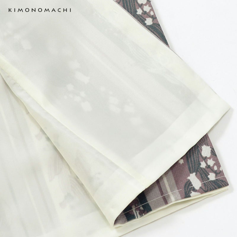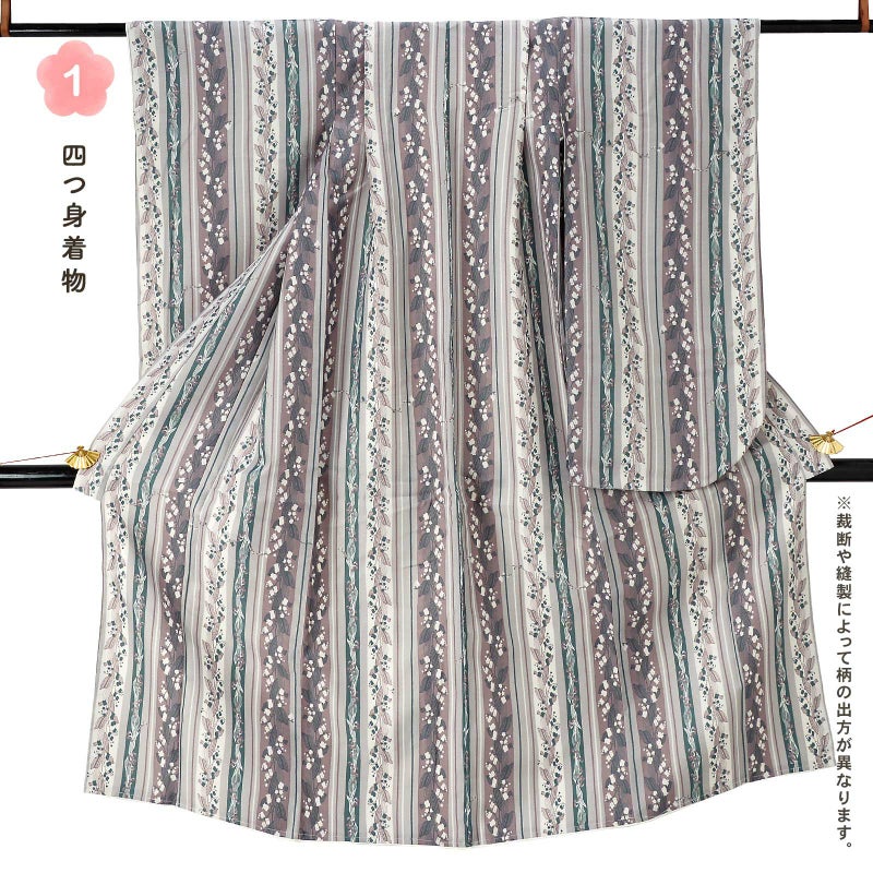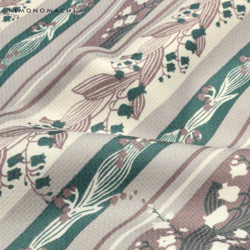着物:細かな地模様のある生地。淡いグレー地にオフホワイト、グレイッシュなパープルと青緑色の縦縞の中に、抽象的に表現された大小のスズランの連続模様が配置されています。かわいらしいスズランを更紗縞風に構成し、現代的な配色で大人っぽく仕上げたデザインです。裏地は白。