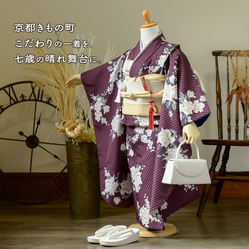 京都きもの町 こだわりの一着を、七歳の晴れ舞台に。 七五三 7歳 四つ身着物セット「ストライプブーケ プラム」女の子 7才 女児用 子供着物 七才のお祝い着向け KIMONOMACHI オリジナル【メール便不可】
