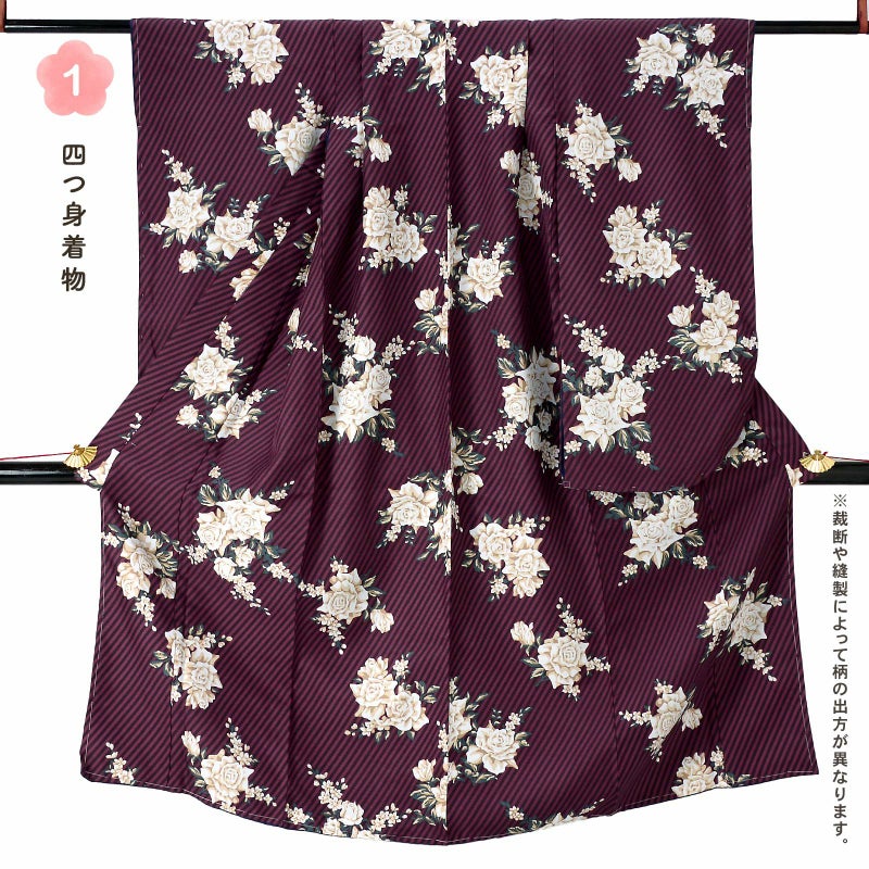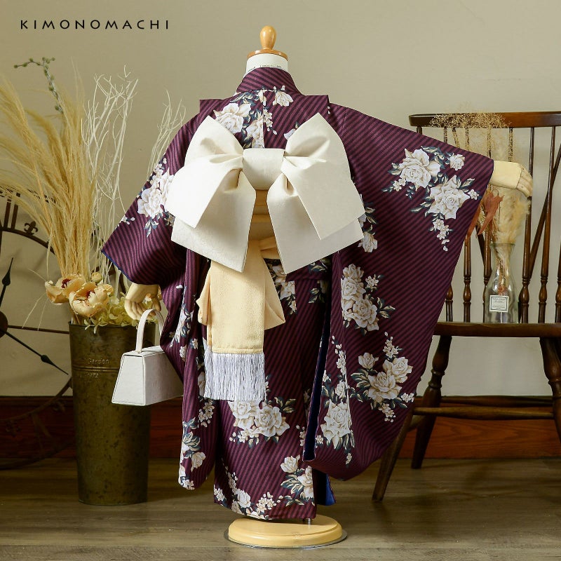 6. 七五三 7歳 四つ身着物セット「ストライプブーケ プラム」女の子 7才 女児用 子供着物 七才のお祝い着向け KIMONOMACHI オリジナル【メール便不可】